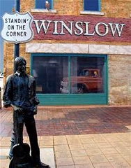 Because that second verse got so famous, the city of Winslow, Arizona erected a bronze statue (life-size) and mural commemorating the song. The statue stands near a lamp post, the male figure holding an acoustic guitar. Above his head there is a sign with the words “Standin’ on the Corner”. The mural behind the statue is of a storefront with a window that reflects a red flatbed Ford pickup driven by a blonde-haired woman. If you look closely at the picture above, you can see an eagle sitting on the upper left window. Very cool.